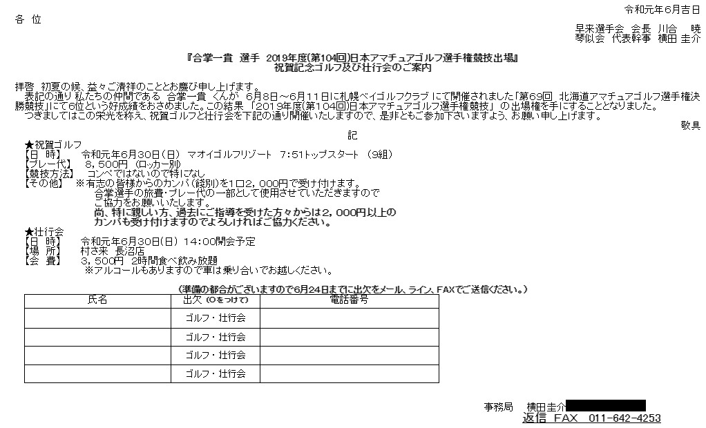 合掌一貴日本アマ出場壮行会案内